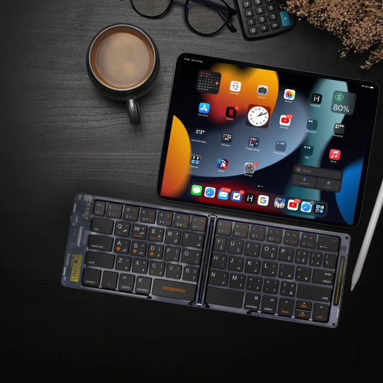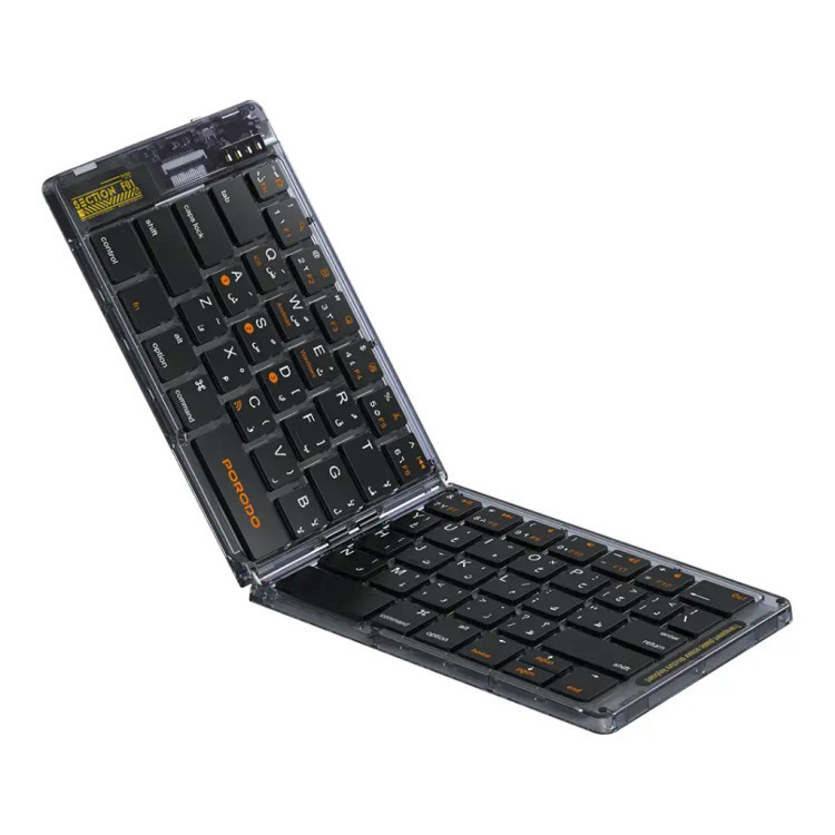 ای قیچی شکل است و دارای طرحبندی ۶۵ کلیدی شامل زبان عربی است که در نهایت به کاربران دو زبانه اجازه میدهد از تایپ روان و سریع لذت ببرند. این کیبورد همچنین با ویندوز، iOS، اندروید و مک سازگار است. به راحتی به دستگاهها متصل میشود. در این طراحی تاشو، یک قاب پشتی چرمی برای دوام و ایجاد حس شیکتر برای حمل و نقل بیشتر وجوددارد. این دستگاه مجهز به پورت شارژ Type-C است و با سرعت ۵۰ تا ۱۰۰ میلیآمپر شارژ میشود. زمان خواب ۱۰ دقیقه است که باعث صرفهجویی در مصرف انرژی میشود. کیبورد بیسیم Porodo Crystal Shell جمعوجور، شیک و کارآمد است و بدون از دست دادن عملکرد، آن را راحت میکند.