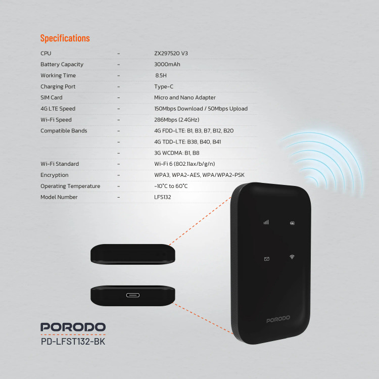 مودم جیبی پرودو PD-LFST132 ظرفیت ۴G LTE و WiFi 6