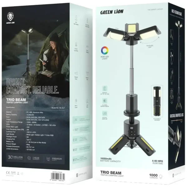 چراغ کمپینگ سهپایهای Green Lion Trio Beam Tripod Camping Light – مشکی یک راهحل عالی برای تأمین نور در فضای باز، کمپینگ، کوهنوردی یا حتی موقعیتهای اضطراری است. این چراغ قابلحمل از ترکیب PC، ABS و آلومینیوم ساخته شده که دوام و مقاومت بسیار بالایی دارد و در عین حال استفاده از آن بسیار آسان است.