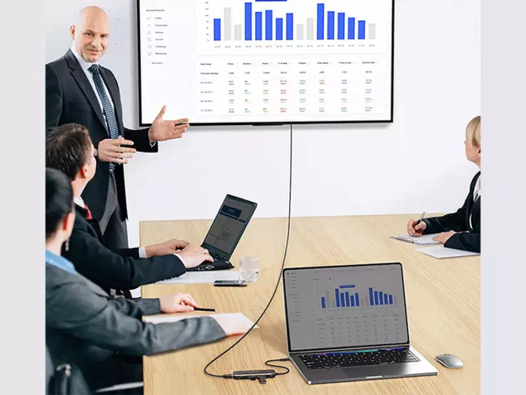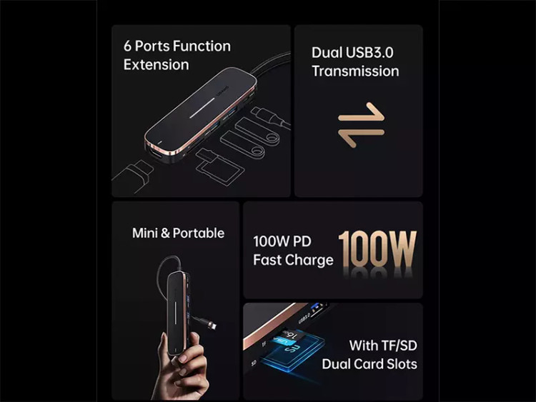 ✅️هاب تایپ سی یوسامز مدل US-SJ575 با 6 پورت Type-C*1+USB3.0*2+Micro S-D*1+S-D*1+HD-MI 1.4*1 میتواند جبران درگاه های نداشته دستگاه شما را بکند. شما میتوانید از این هاب 6 پورته برای ایجاد ارتباط بین انواع لوازم خود یا اتصال همزمان آنها به برق استفاده کنید. دانگل ماوس و کیبورد، حافظهی فلش، پرینتر، پنکهی رومیزی و …، تنها بخشی از این وسایل هستند که با استفاده از هاب یوسامز قادر به بهرهبرداری از آنها میباشید.