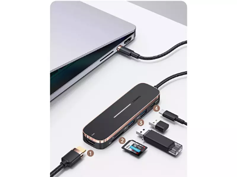 ✅️هاب تایپ سی یوسامز مدل US-SJ575 با 6 پورت Type-C*1+USB3.0*2+Micro S-D*1+S-D*1+HD-MI 1.4*1 میتواند جبران درگاه های نداشته دستگاه شما را بکند. شما میتوانید از این هاب 6 پورته برای ایجاد ارتباط بین انواع لوازم خود یا اتصال همزمان آنها به برق استفاده کنید. دانگل ماوس و کیبورد، حافظهی فلش، پرینتر، پنکهی رومیزی و …، تنها بخشی از این وسایل هستند که با استفاده از هاب یوسامز قادر به بهرهبرداری از آنها میباشید.