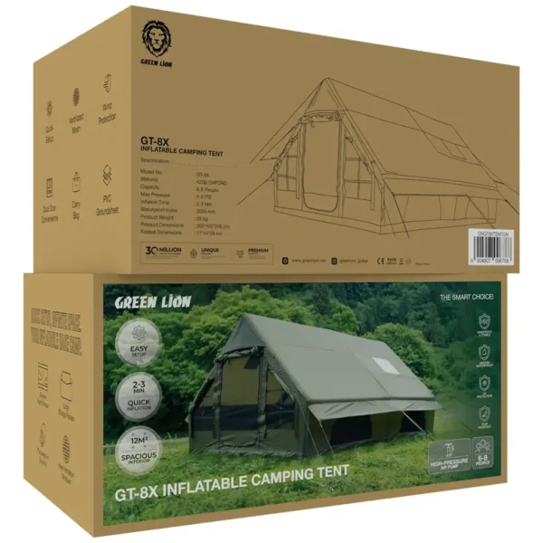 چادر بادی Green Lion GT-8X Inflatable Camping Tent – سبز یک انتخاب فوقالعاده برای کمپینگ خانوادگی یا گروهی است. این چادر با ظرفیت مناسب برای ۶ تا ۸ نفر طراحی شده و علاوه بر فضای بسیار وسیع، محافظت قابلاعتماد در شرایط مختلف آبوهوایی را فراهم میکند.