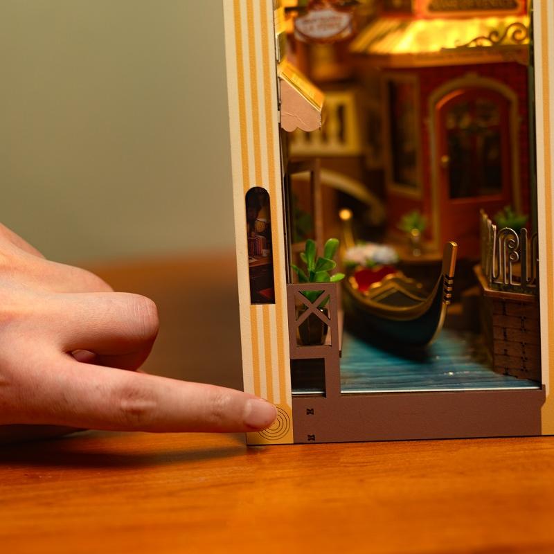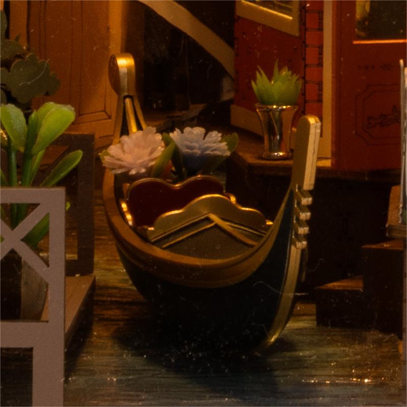 ساختنی Romantic Venice به سیستم نورپردازی لمسی مجهز است که با لمس فعال میشود. نور گرم در پسزمینهی نماها پخش میشود و انعکاس آن روی سطح آب، حس غروب ونیز را تداعی میکند. جعبهی باتری بهصورت پنهان در بخش زیرین قرار گرفته تا ظرافت ساخت حفظ شود. با روشن شدن چراغها، صحنه بهطرزی رؤیایی زنده میشود، گویی قایقها آرام در نور طلایی عصر شناورند.