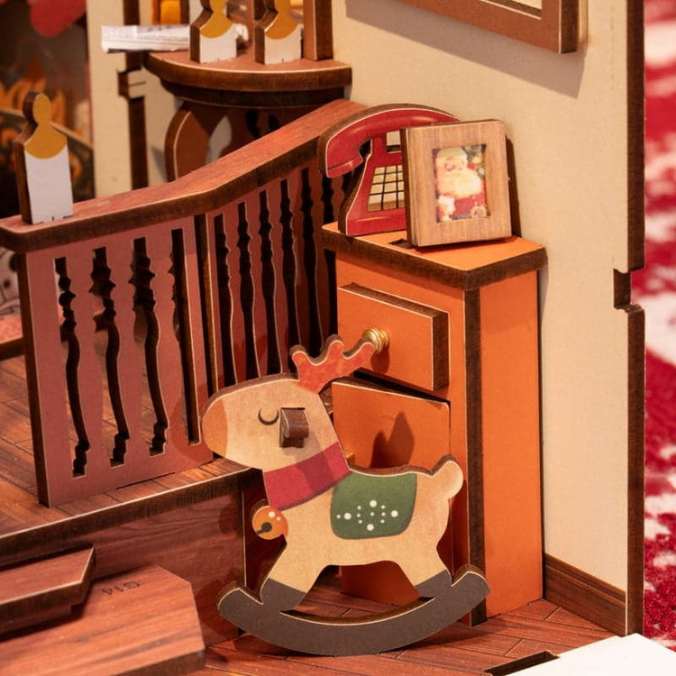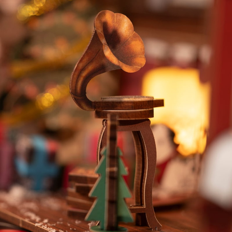 صحنهی اصلی این مدل، یک اتاق نشیمن راحت و پرجزئیات است. در مرکز اتاق، درخت کریسمس با چراغها و روبانهای رنگی تزئین شده و کادوهای پیچیدهشده با کاغذهای براق زیر آن چیده شدهاند. کنار شومینهی روشن، جورابهای کریسمسی منتظر هدیههای بابانوئل هستند و روی طاقچه، تزئینات کوچک و فرشتههای کوچک قرار گرفتهاند. یک گرامافون قدیمی در گوشه اتاق قرار دارد و سگی که روی زمین دراز کشیده و انگار با دقت به موسیقی گوش میدهد. قفسهی کتاب، پنجرهی بزرگ و پردهها، فضا را به یک نشیمن واقعی و زنده نزدیک میکنند.