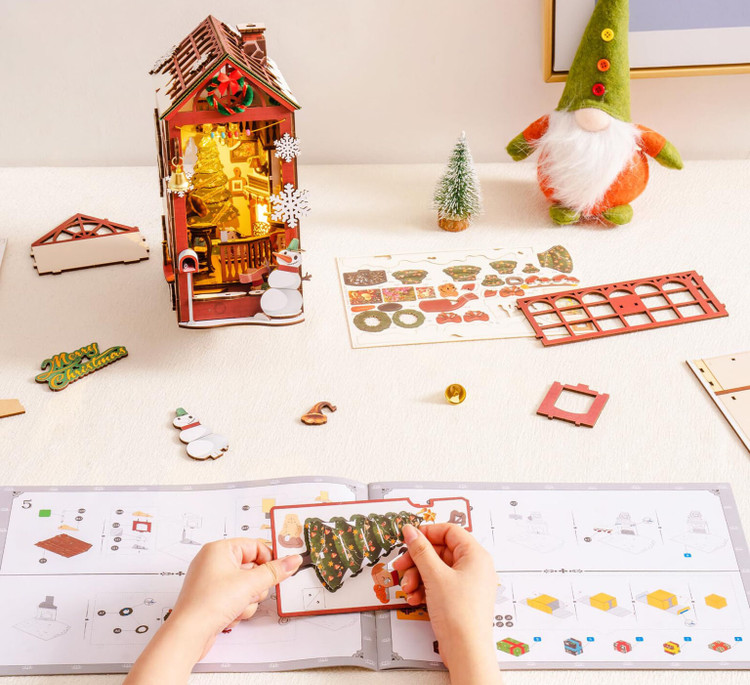 قطعات این مدل از چوب با برش دقیق لیزری ساخته شدهاند و همهی صفحات از قبل رنگآمیزی شدهاند، بنابراین نیازی به نقاشی جداگانه نیست. طراحی اتصال فشاری باعث میشود بدون چسب بتوانید قطعات را در کنار هم قرار دهید. راهنمای مونتاژ و شمارهگذاری روی قطعات، کار را حتی برای سازندگان مبتدی هم ساده میکند. در حدود 3 ساعت میتوان این صحنهی کامل کریسمسی را سرهم کرد و قدمبهقدم از این فرایند لذت برد.