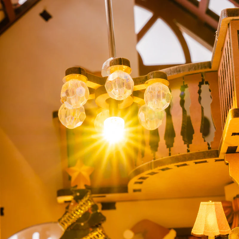 این بوکنوک به سیستم نورپردازی لمسی مجهز است. با یک لمس، چراغهای LED از دو نقطه فضا را روشن میکنند، یکی از سمت لوستر سقفی و دیگری از شومینه. نور گرم، رنگ چوب، درخشش تزئینات درخت و جزئیات مبلمان را برجسته میکند و صحنه را شبیه یک قاب زنده از شب کریسمس میسازد. جعبه باتری در بخش پایینی بهصورت مخفی طراحی شده تا ظاهر کار تمیز و یکپارچه بماند.