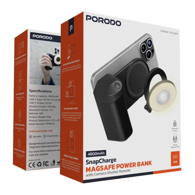 پاوربانک Porodo 4800mAh SnapCharge MagSafe با عملکرد بالا و ویژگیهای هوشمند، در طراحی زیبا و جمعوجور خود، جلوهای بینظیر به آن بخشیده است. این پاوربانک با ظرفیت ۴۸۰۰ میلیآمپر ساعت، شارژ کافی برای شارژ دستگاههای شما در هر زمان که به آن نیاز دارید را فراهم میکند. این پاوربانک که به ورودی/خروجی USB-C مجهز است، انتقال سریع برق را تضمین میکند. میتوانید گوشی خود را با خروجی ۱۰ وات به صورت بیسیم شارژ کنید و در عین حال به بلوتوث نسخه ۵.۱ برای کنترل از راه دور شاتر دوربین خود متصل باشید. گیره مغناطیسی قوی تضمین میکند که پاوربانک هرگز هنگام اتصال به گوشی به طور تصادفی جدا نمیشود و چراغ حلقهای جداشدنی MagSafe، روشنایی بیشتری را برای نیازهای گوشی شما فراهم میکند. چراغ حلقهای قابل چرخش ۳۶۰ درجه با تنظیمات لمسی سفارشی و آینه داخلی، برای برقراری تماسهای ویدیویی یا گرفتن سلفی مناسب است. این گیره و پایه چرخان با قابلیتهای شارژ و هندزفری، برای هر کسی که به برق و راحتی در حال حرکت نیاز دارد، مفید است.