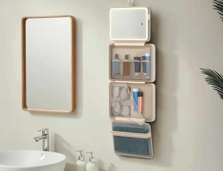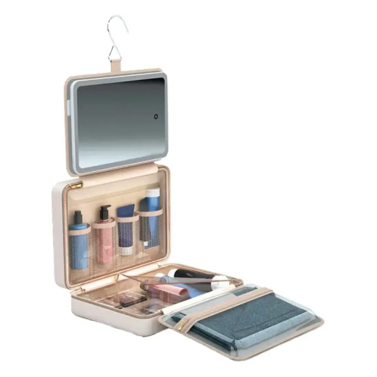 آینه LED جداشدنی/دارای قلاب آویز برای استفاده آسان در سفر/محفظههای متعدد برای نظمدهی لوازم آرایش/طراحی جمعوجور و بسته/مناسب استفاده خانگی و مسافرت/کنترل شدت نور