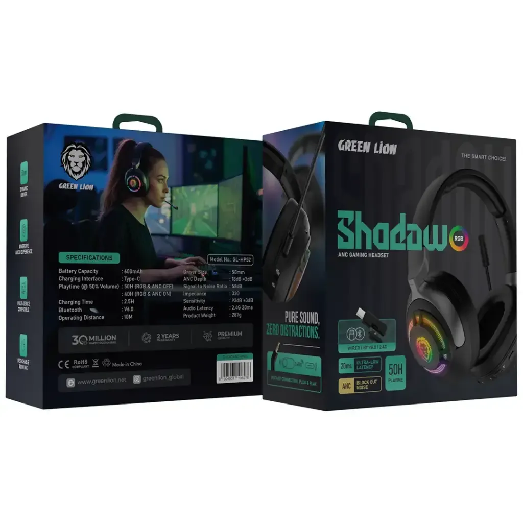 Green Lion Shadow ANC Gaming Headset ترکیبی از طراحی مدرن، عملکرد حرفهای و راحتی در استفاده طولانیمدت است؛ گزینهای عالی برای گیمرهای جدی.
