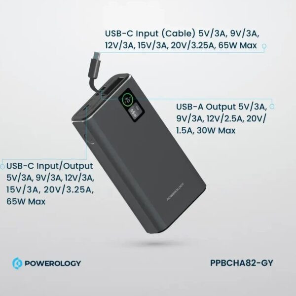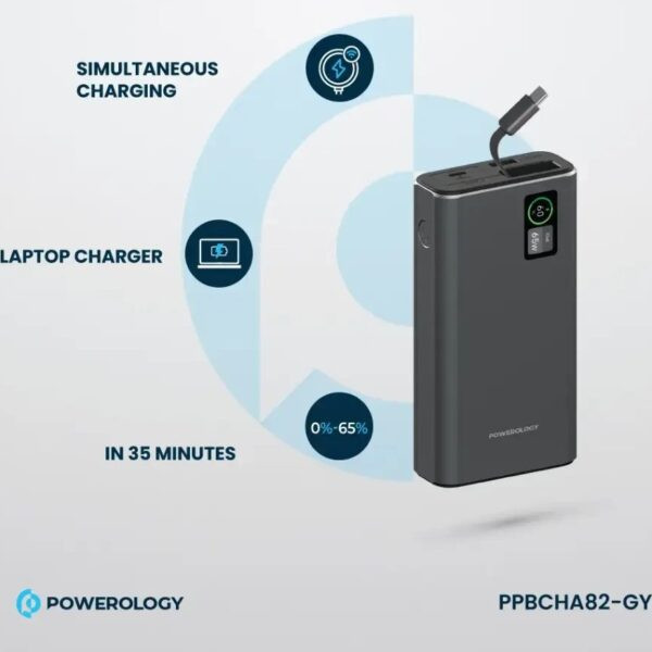 پاوربانک 20000 فست شارژ تایپسی 65 وات و یواسبی 30 وات پاورولوژی PPBCHA82-GY