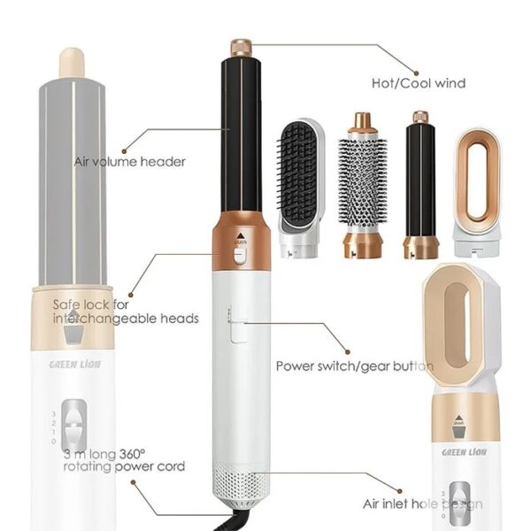 مشخصات، قیمتو خرید سشوار برس دار حالت دهنده گرین لاین مدل Hair Styler 2. دستگاه استایلر مو 5 در 1 گرین لاین Green Lion 5 in 1 Professional Hair Styler 2 با کد فنی GN5N1PHSTYWH دارای پنج ضمیمه برس قابل تعویض است که باعث صاف کردن، فر کردن، ترکیب سشوار با برس های حالت دهنده می شود، می تواند برای طول های مختلف مو مناسب باشد و سبک های مختلفی ایجاد کند. صاف کننده هوای گرم ما دارای فناوری پیشرفته یون منفی و روکش سرامیکی است که از موخوره و الکتریسیته ساکن جلوگیری می کند. این برس سشوار به لطف ترکیبی از پینهای نایلونی و موهای پرزدار، گرهخوردگی و شکستگی را به حداقل میرساند و در عین حال به ماساژ راحت پوست سر کمک میکند. این سشوار با موتور 60000 دور در دقیقه دارای ظرفیت 1000 وات و کنترل دمای 3 سرعته می باشد تا هنگام حالت دادن مو به شما کنترل بهتری دهد. همچنین برای استفاده در فصول مختلف مناسب است و برای انواع موها مناسب است و به شما کمک می کند به راحتی مدل مویی را که همیشه می خواستید به دست آورید. این حالت دهنده با پوشش هوا فقط از هوا برای جذب و پیچیدن مو استفاده می کند. لازم نیست نگران درد بازو باشید. این برس مو سبک وزن است، حمل آن آسان است، و به راحتی قابل حمل است برای مچ دست شما عالی است. تطبیق پذیری ظاهری و نتایج عالی را برای انواع مو فراهم می کند. این دستگاه یک هدیه عالی برای زنان و دختران است. میتوانید از این محصول در مسافرت ها ومهمانی ها استفاده کنید و بدون صرف وقت اضافی موهایتان را صاف و یا فر کنید.